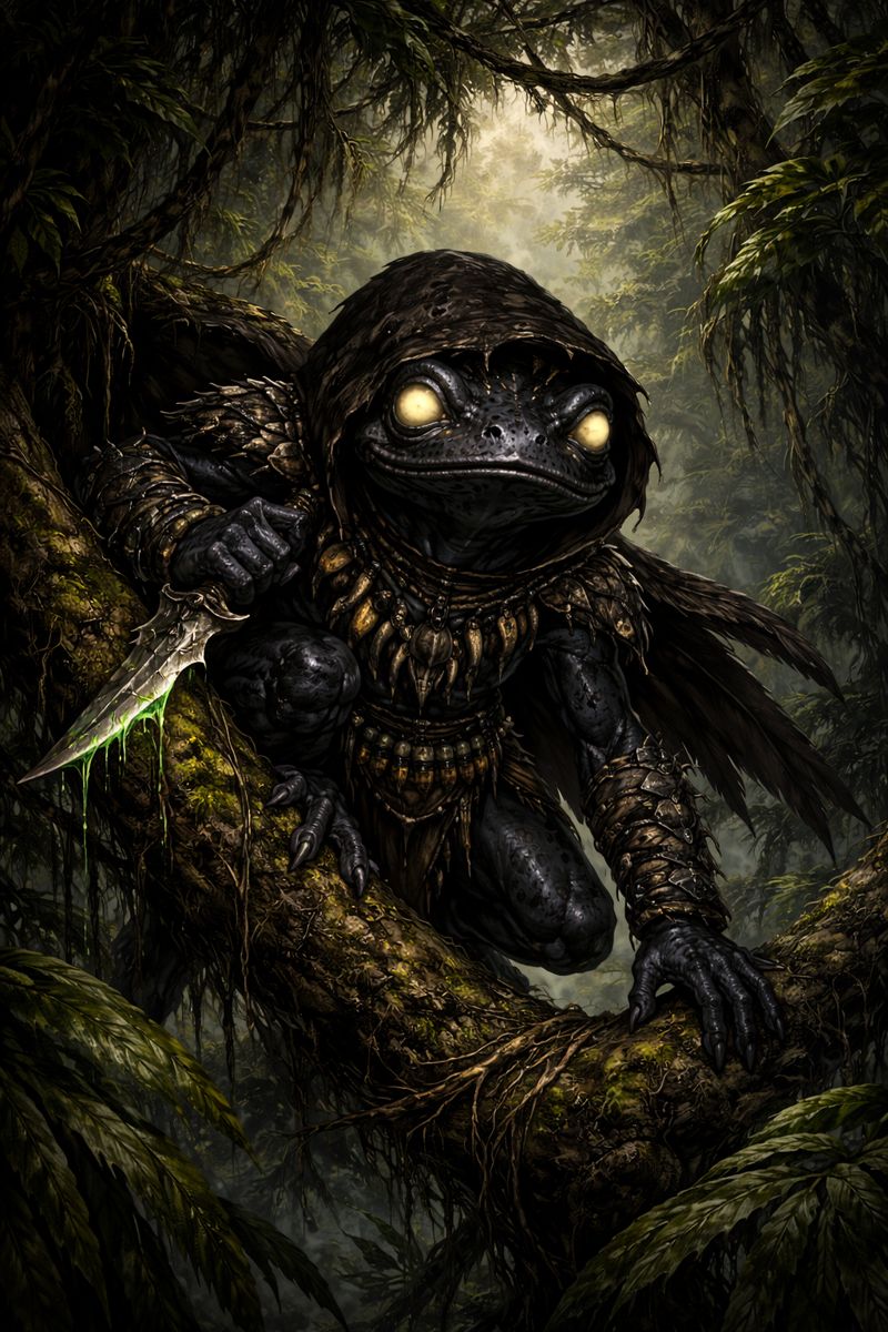 Os grungs pretos são os mais furtivos e enigmáticos de seu povo. Pequenos humanoides anfíbios de pele negra brilhante — por vezes com manchas acinzentadas —, movem-se com a leveza do silêncio e raramente são vistos antes de já terem ido embora. Em suas tribos, são espiões, caçadores e assassinos: os olhos e as garras ocultas do povo grung.